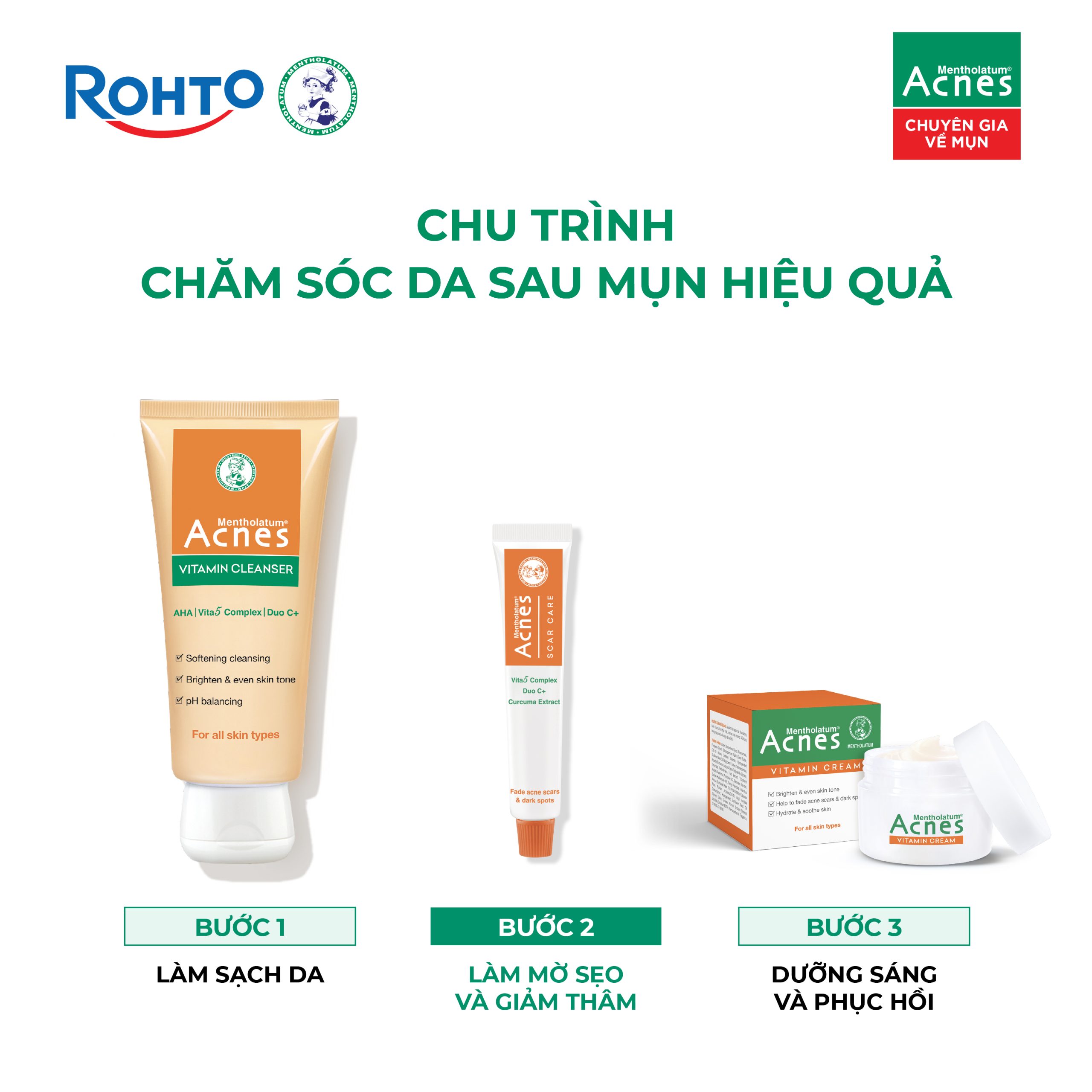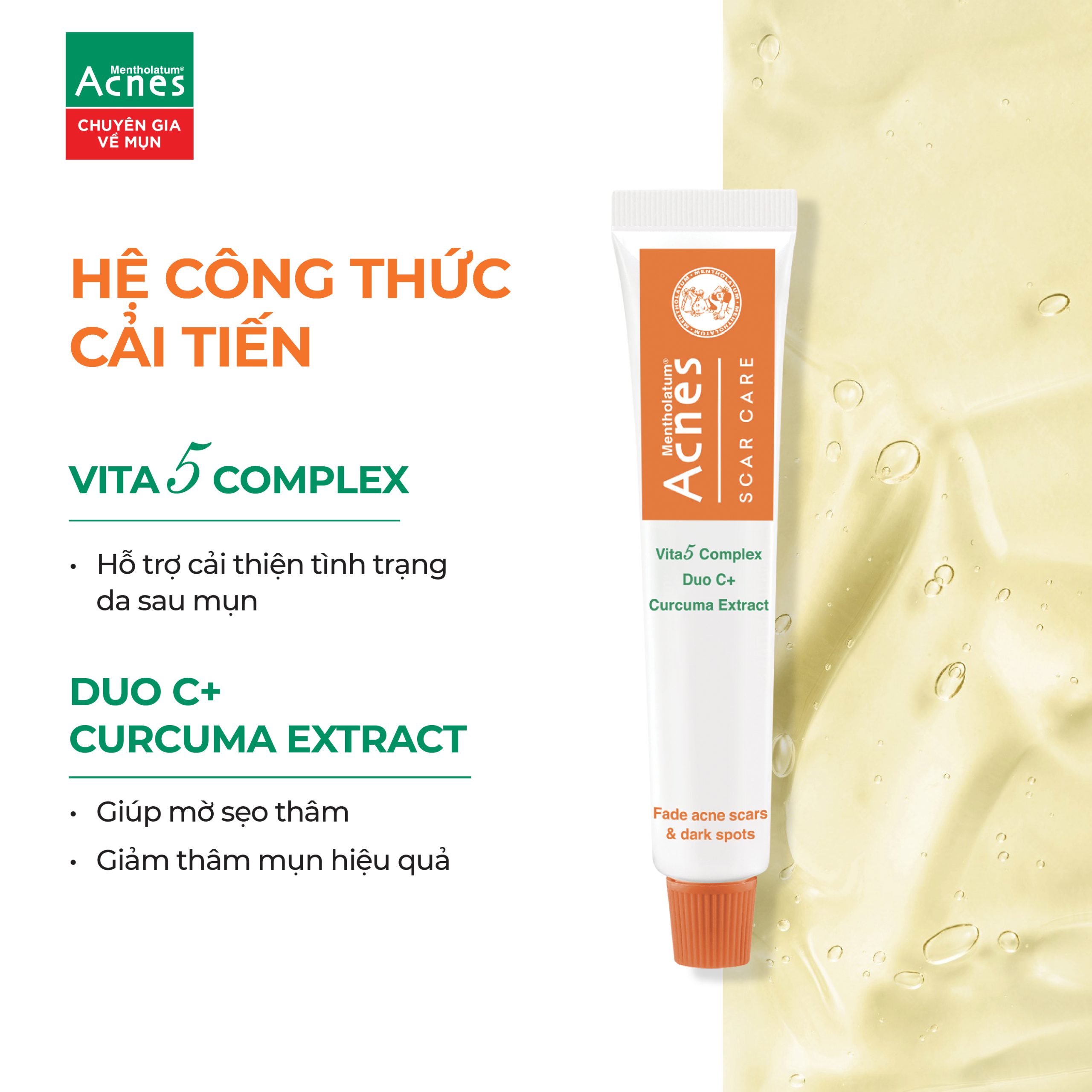 - Phức hợp Vitamin C, E, B6 và Tinh chất nghệ. Giúp làm giúp cấu trúc sợi collagen và elastin vững chắc. Đồng thời ức chế sự hình thành và làm mờ sắc tố melanin trên da. Yếu tố tiên quyết để trị thâm và sẹo sau mụn.