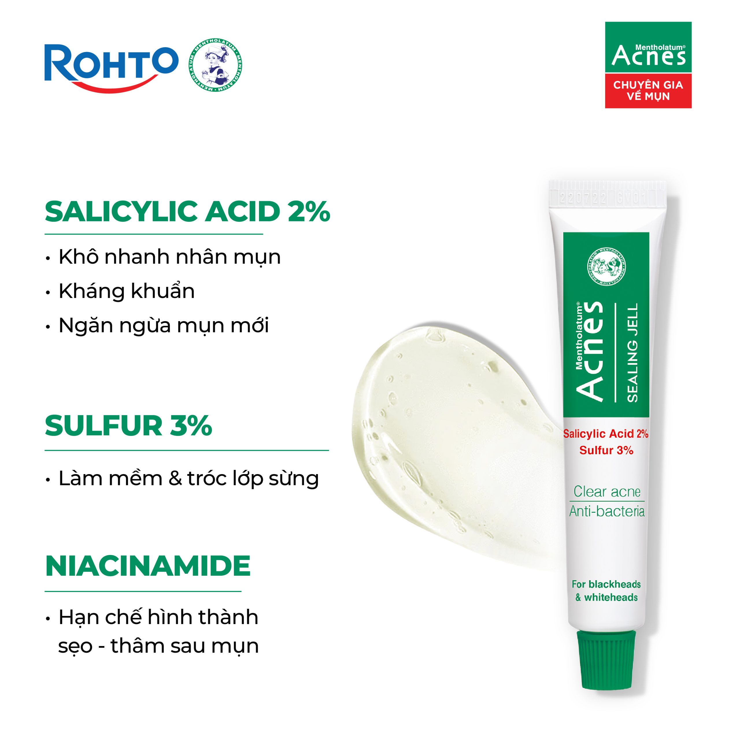 Gel trị mụn Acnes Sealing Jell với công thức đột phá Trio-Activ giúp làm mềm và giúp nhân mụn thoát ra dễ dàng, đồng thời kháng khuẩn, ngăn ngừa hình thành nhân mụn mới. Làm mềm nhân mụn, tróc lớp sừng da; giúp lỗ chân lông thông thoáng, cối mụn dễ dàng thoát ra ngoài.